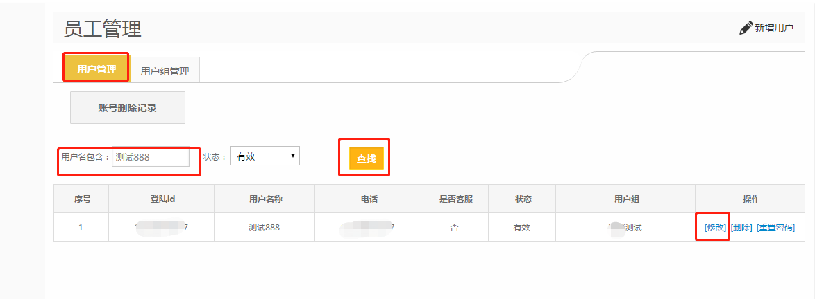 第二步:在【用户管理】去查找需要设置为客服的员工名称,找到这个员工然后点击【修改】;