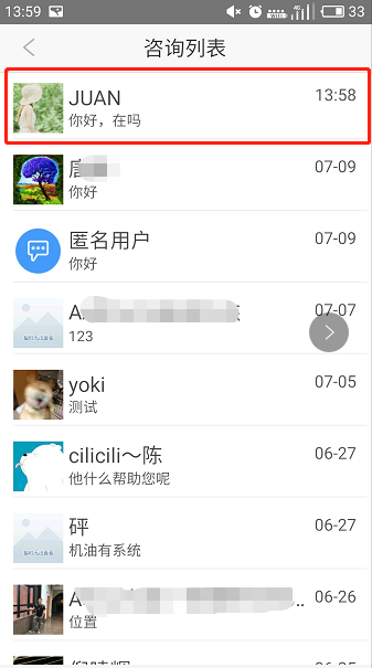 第六步:这里可以查看到所有车主在公众号上咨询发送的信息,点击单个车主即可查看到里面车主发送的全部内容。