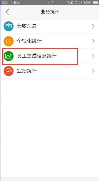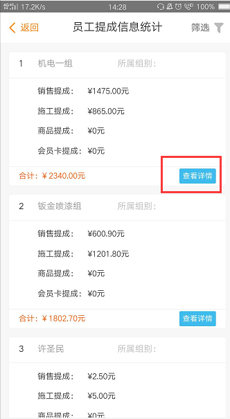 操作:点击【业务统计】-【员工提成信息统计】-选择要查看的员工【查看详情】;