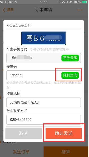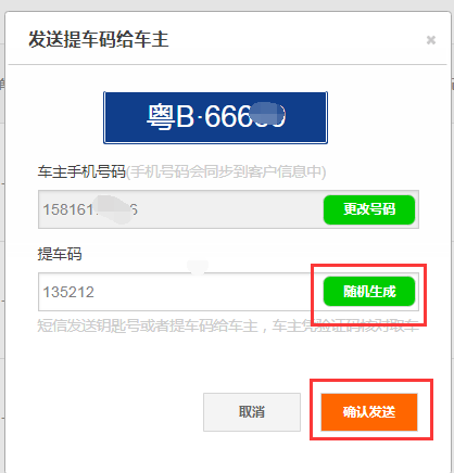 第二步:确认接收信息的手机号后【随机生成】提车码,确认发送后即可;