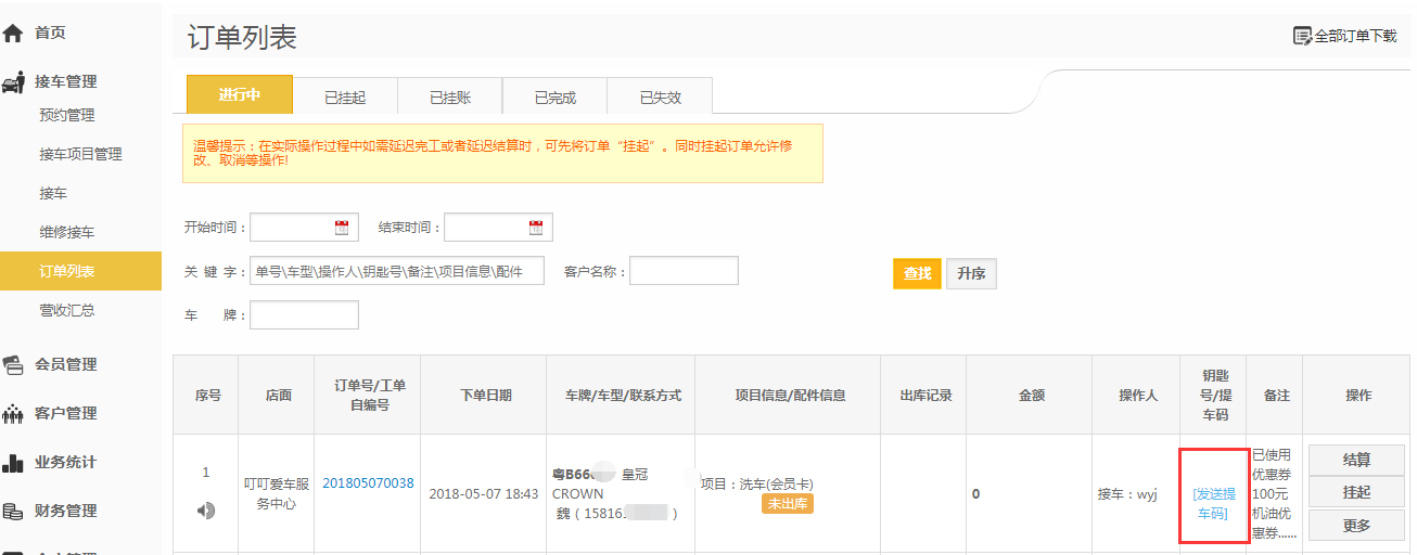 第一步:点击【接车管理】-【订单列表】-找到对应订单【发送提车码】;