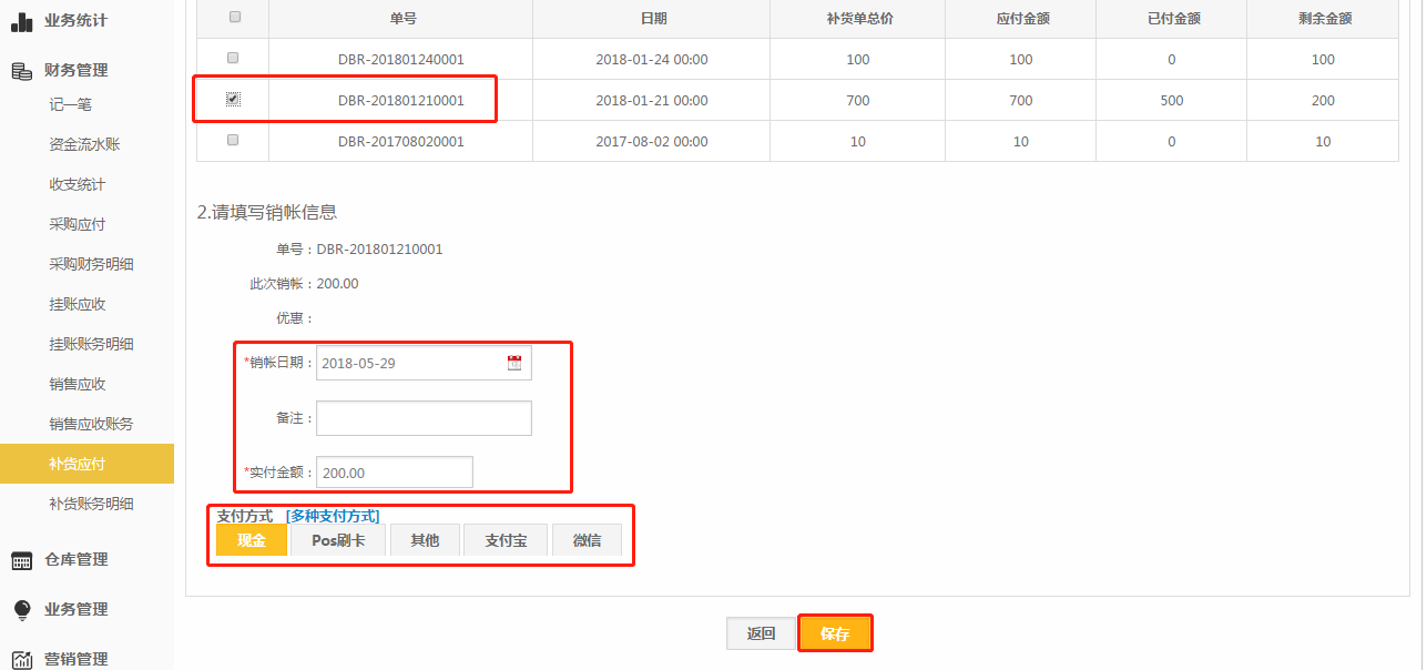2.可以选择还款的日期,修改实付金额,要注意销账不能多次;
