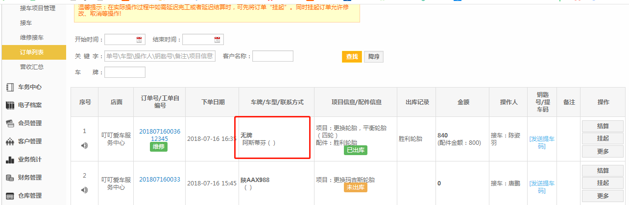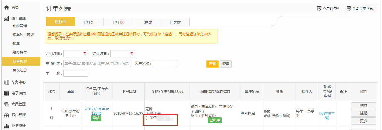 【点击了【同步订单信息】后,可在【接车管理】-【订单列表】中查看添加的手机号码】