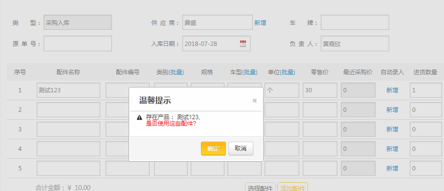 问题1:保存入库单提示:“存在产品:xxx, 是否使用这些配件?“