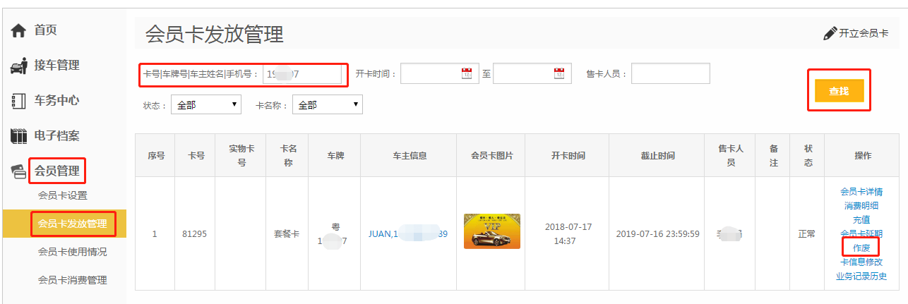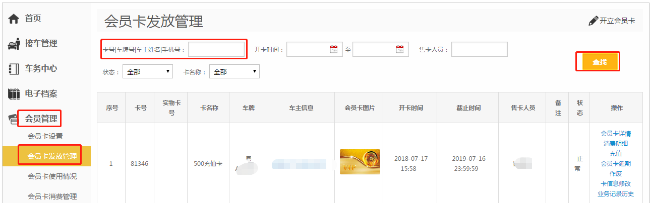 第二步:输入卡号/车牌号/车主姓名/手机号,点击【查找】;