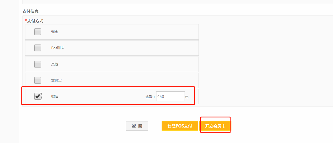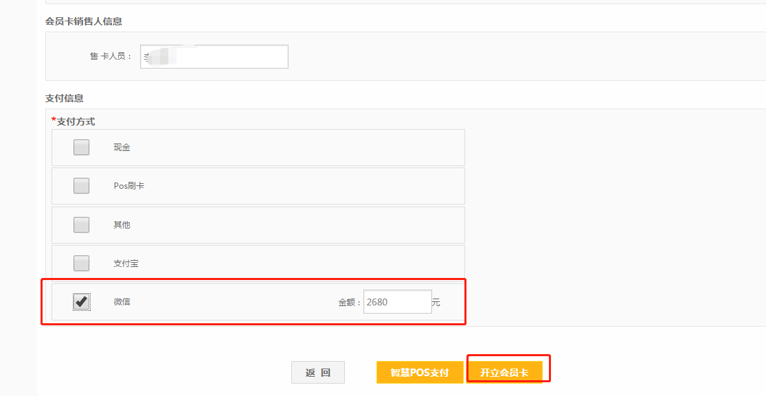 第七步:勾选正确的支付方式,然后点击【开立会员卡】。