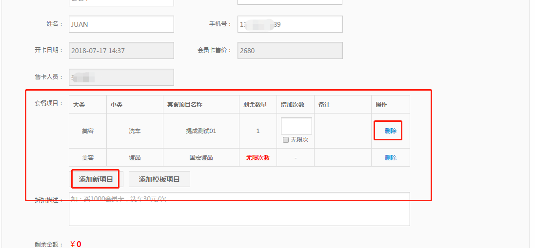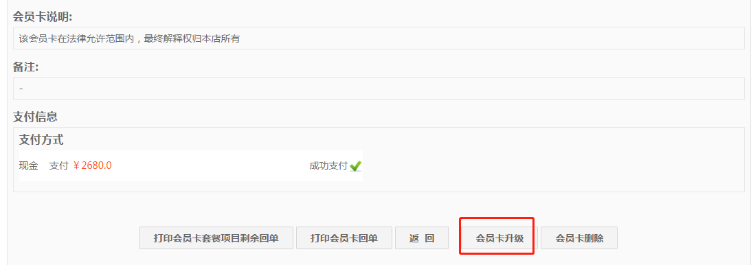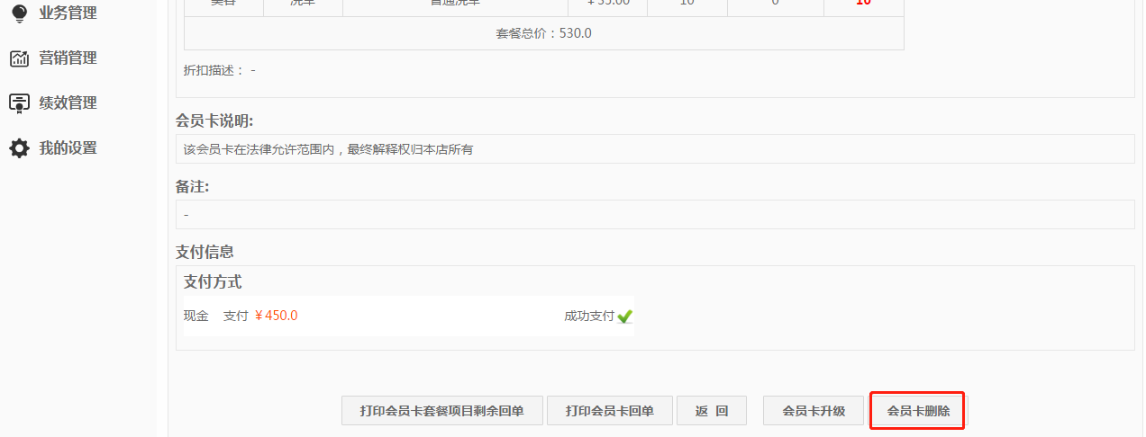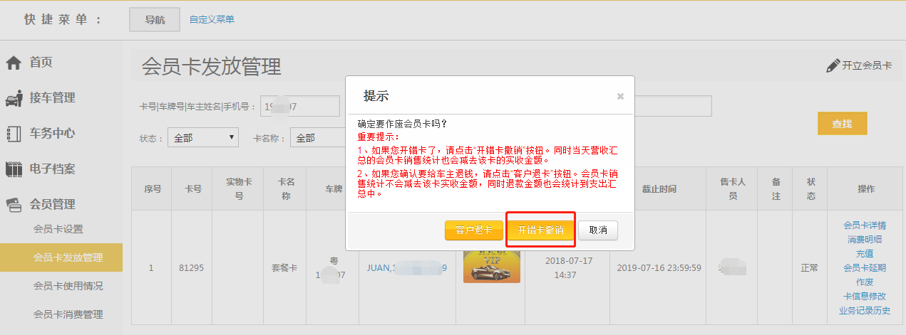注意事项:若开卡后无任何消费,直接点击开错卡撤销;若有消费记录,则需要删除订单再用管理员账号点会员卡详情删除会员卡,再重新开再重新下单;