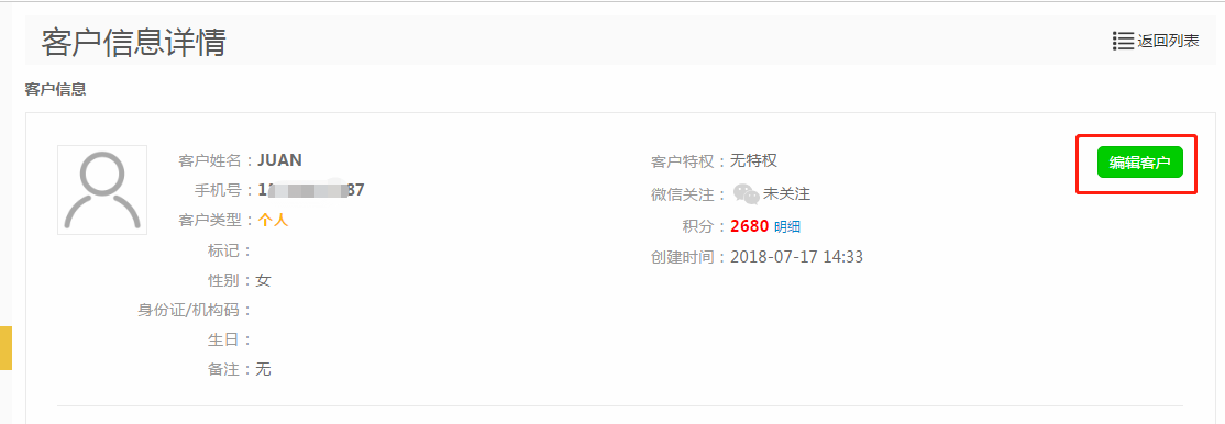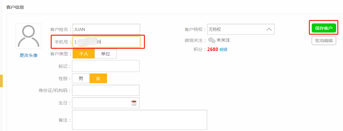 第五步:修改正确的手机号码后,点击【保存客户】;