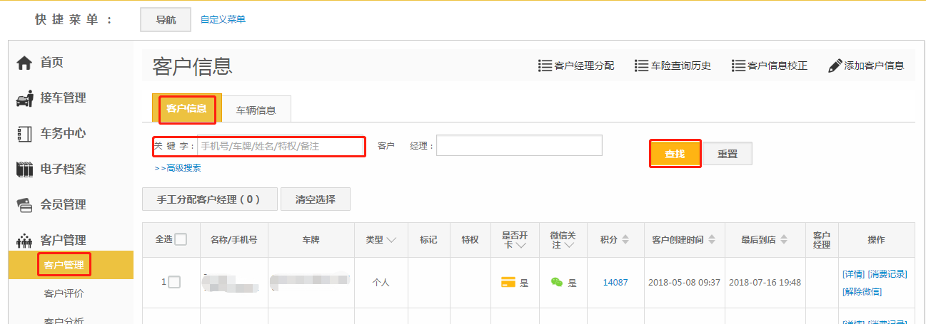 第二步:在【客户信息】里的关键字进行模糊搜索,然后点击【查找】;