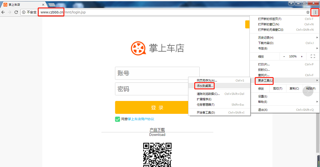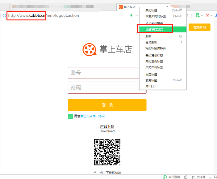 注意事项:掌上车店系统PC端建议使用360或者Google浏览器,以下说明两种浏览器的下载到桌面的方式;