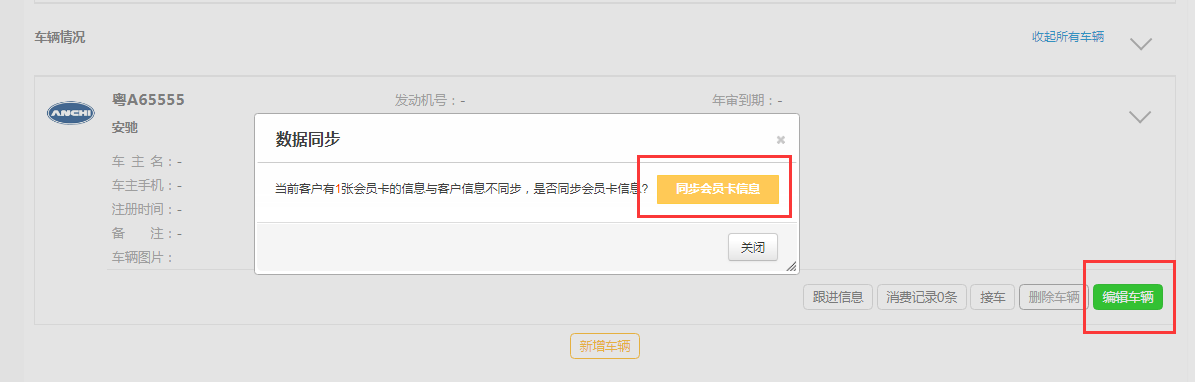 第四步:点击【保存车辆】后会弹窗提示有会员卡信息未同步,点击【同步会员卡信息】即可;