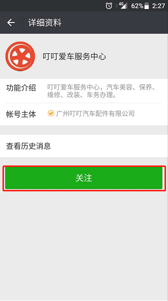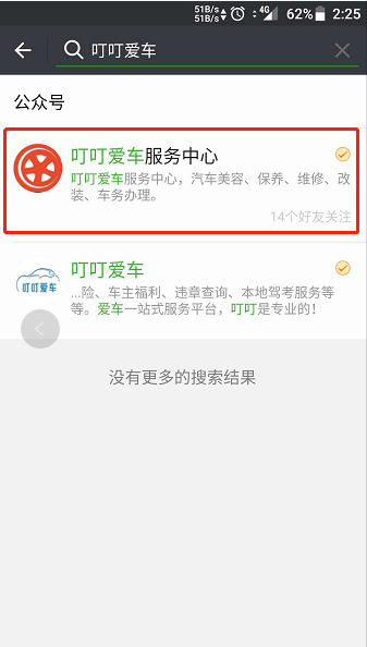 第一步:搜索公众号”叮叮爱车服务中心”;
