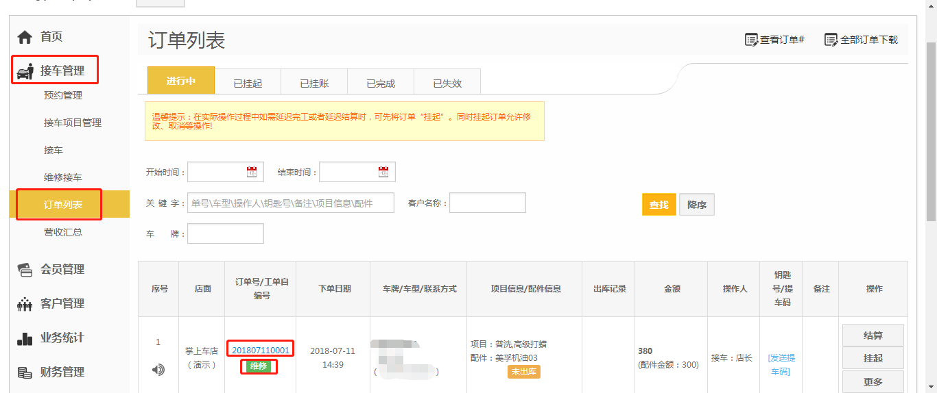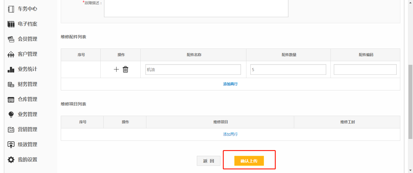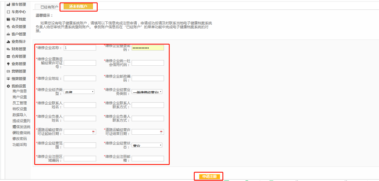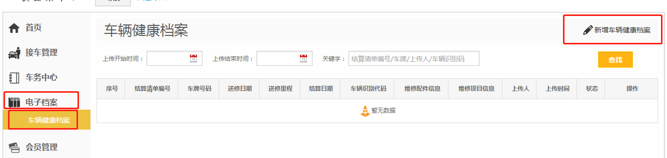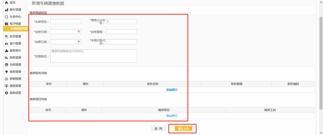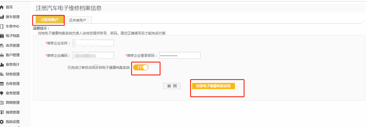 【电子健康档案:政府要求汽车维修的时候必须将维修订单录入系统,全国38个省,每个省都有各自的信息档案平台,我们掌上车店和开发健康电子档案的合作,满足商家直接在我们系统上录入信息上传电子健康档案平台。】