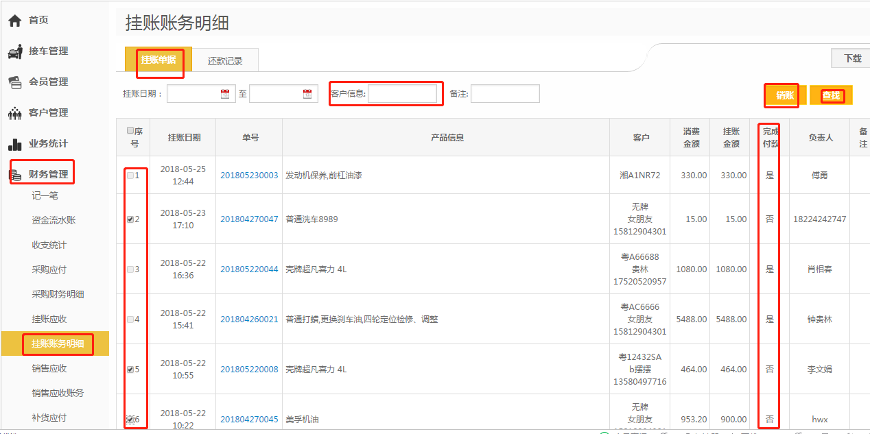 注意事项:1.已销账的订单无法被选中;