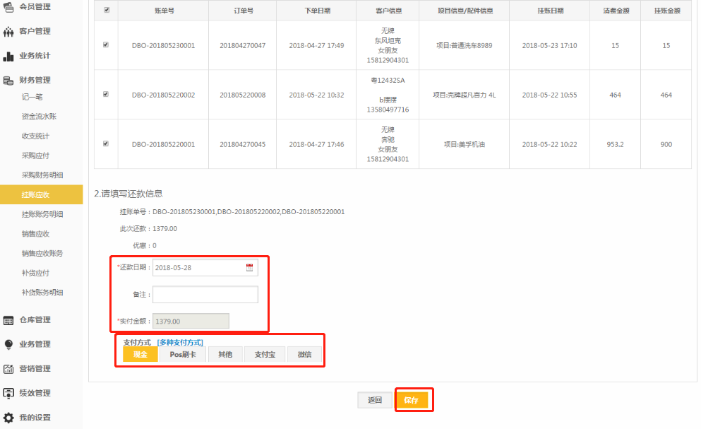 3.可以选择还款日期、修改实付金额,销账不支持多次销账,实付金额低于订单金额,多余金额将默认优惠;;