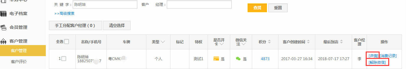 第一步:在客户管理界面搜索需要更改手机号的客户,点击【解绑微信】;
