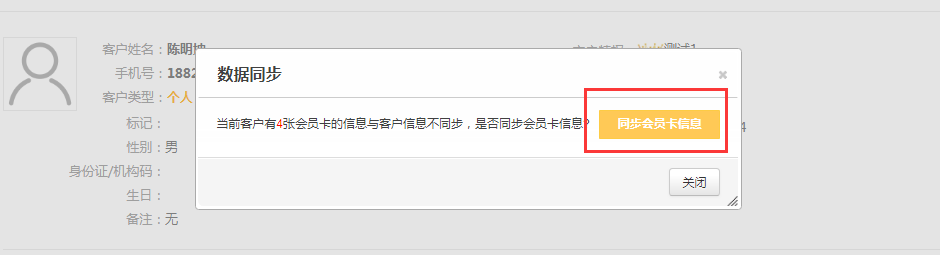 第四步:如果提示会员卡信息同步的提示,点击确认,如果不确认会导致会员管理中会员卡信息和客户信息不符;