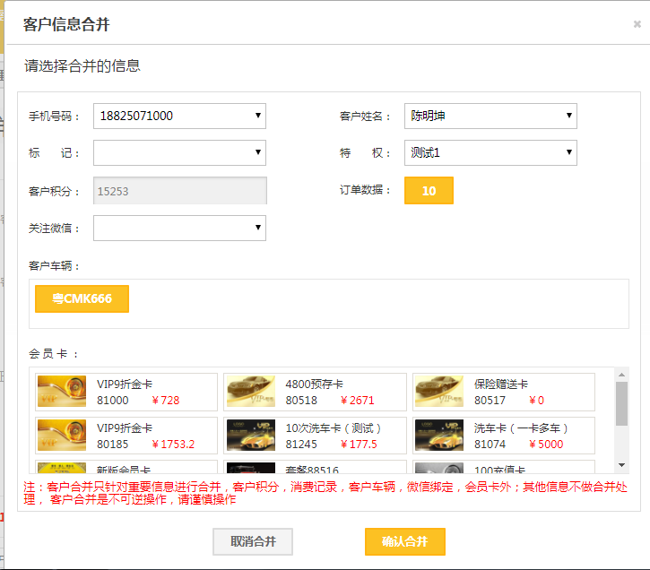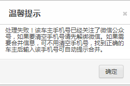 问题1:客户信息保存时提示“处理失败!该车主手机号已经关注了微信公众号,如果要清空手机号请先解绑微信。如果需要合并信息,可不用清空手机号,找到正确的车主后输入该手机号可自动提示合并。”