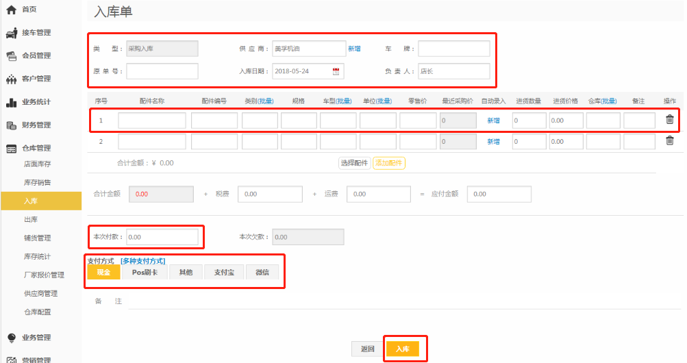注意事项:入库时本次付款低于应付金额会自动生成采购挂账单;